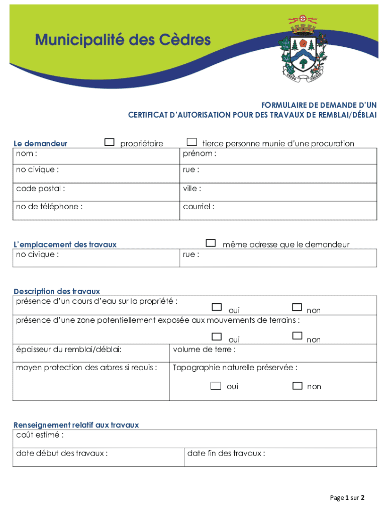 Obtenir le gratuit Service de l'urbanisme Certificat d'autorisation de remblai