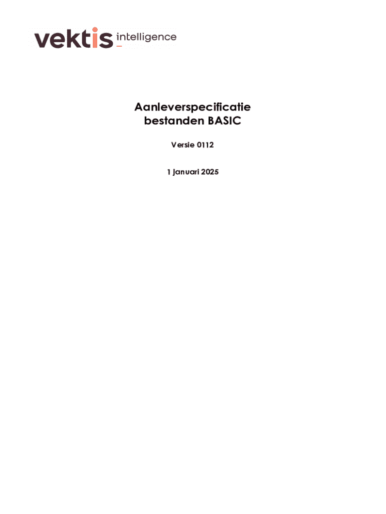 Aanleverspecificatie bestanden BASIC Versie 0112 1 januari 2025Inhoudsopgave 1. 2.3.4.5.Inleiding Algemeen 2.1 Versiebeheer 2.2 Wijzigingstabel 2.3 Contactgegevens Vektis 2.4 Gebruik van de gegevens