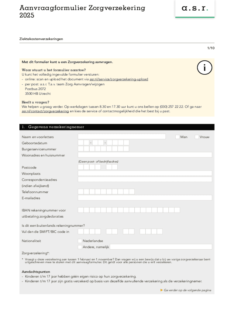 Aanvraagformulier Zorgverzekering 2025Ziektekostenverzekeringen 1/10Met dit formulier kunt u een Zorgverzekering aanvragen. Waar stuurt u het formulier naartoe? U kunt het volledig ingevulde formulier
