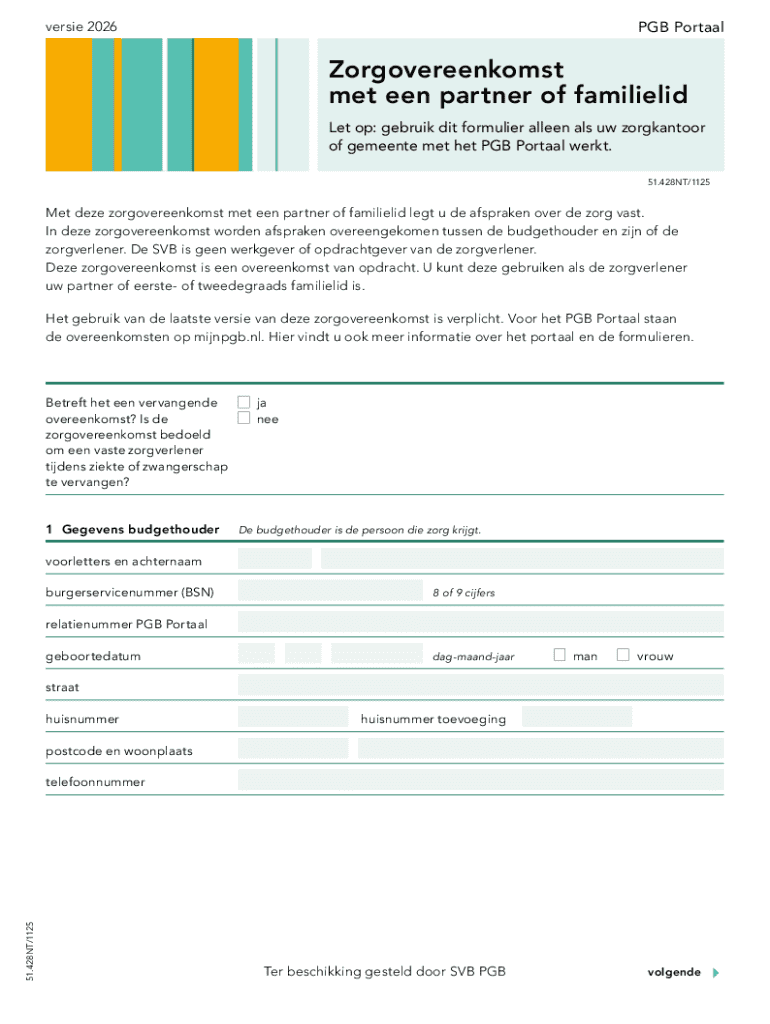 PGB Portaalversie 2026Zorgovereenkomst met een partner of familielid Let op: gebruik dit formulier alleen als uw zorgkantoor of gemeente met het PGB Portaal werkt. 51.428NT/1125Met deze zorgovereenkomst