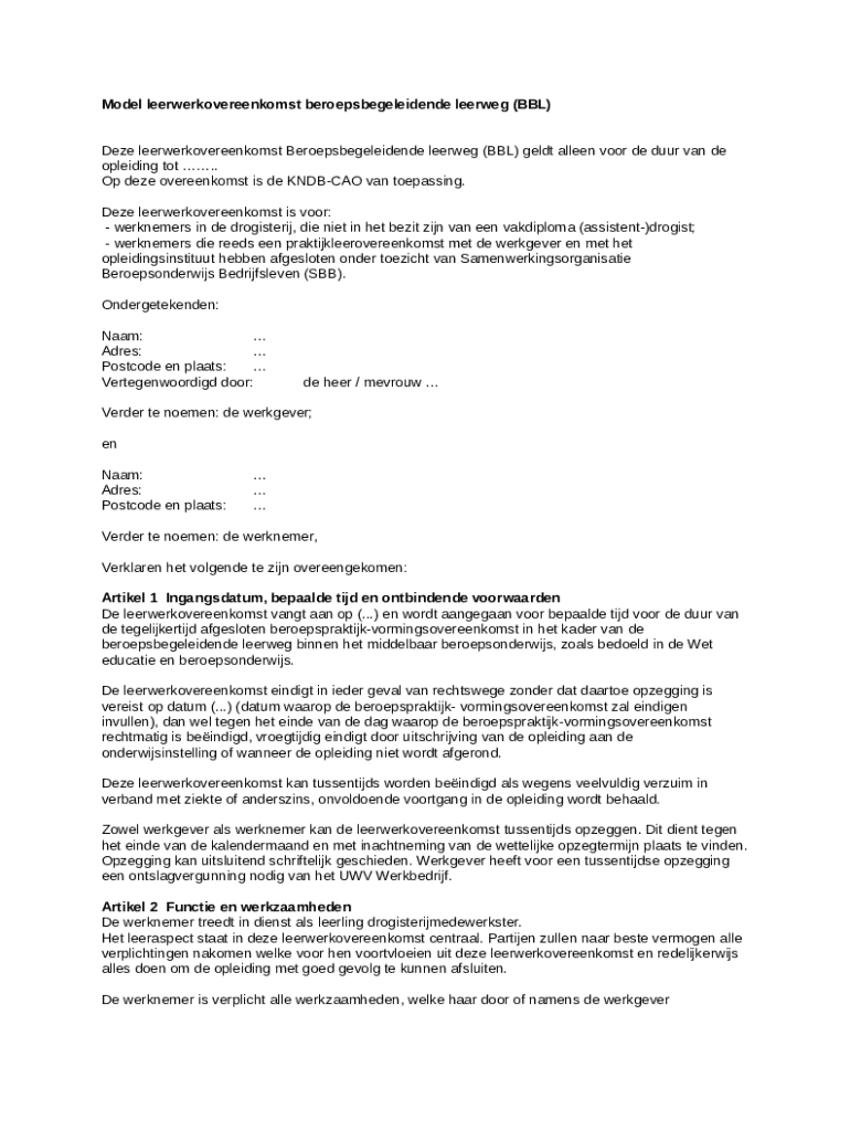 Ketenregeling en arbeidsovereenkomst op basis van de BBL template instructions