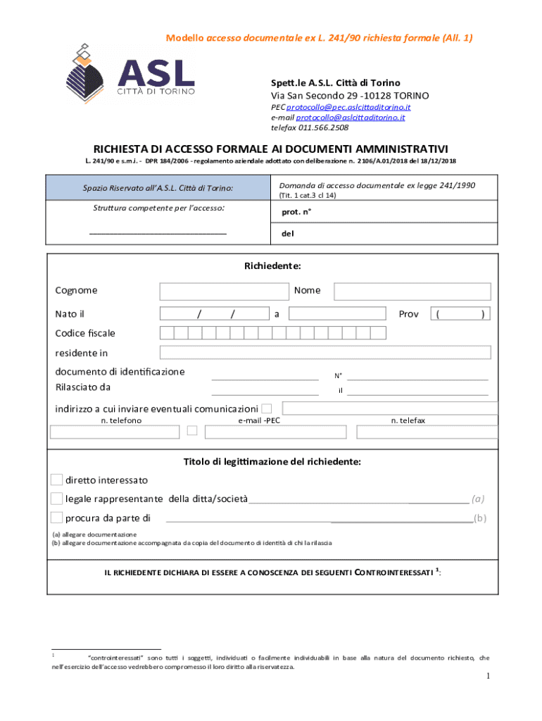 Ottieni il gratuito Richiesta di accesso formale agli atti ex L. 241/90 (All. 1)