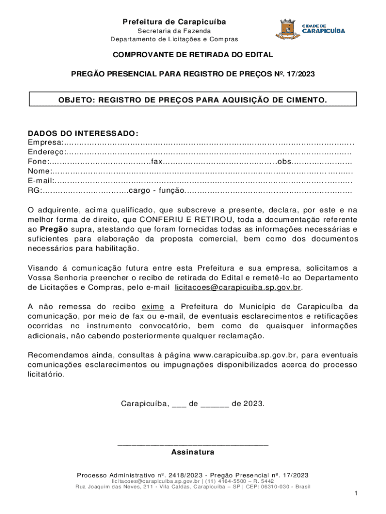 Prefeitura de Carapicuba Secretaria da Fazenda Departamento de Licitaes e ComprasCOMPROVANTE DE RETIRADA DO EDITAL PREGO PRESENCIAL PARA REGISTRO DE PREOS N. 17/2023OBJETO: REGISTRO DE PREOS PARA