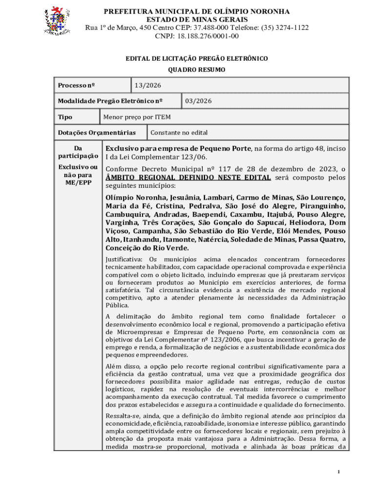 Obtenha o gratuito Licitaes e Editais de Olmpio Noronha (MG)