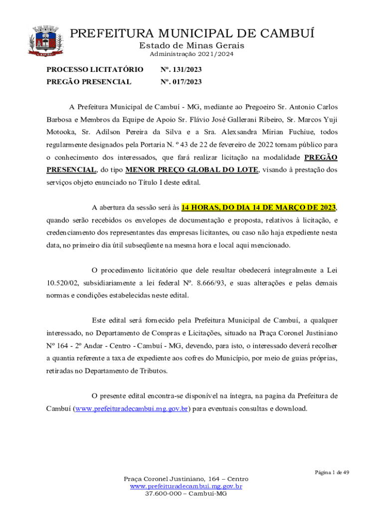 Obtenha o gratuito A Prefeitura Municipal de Cambu - MG, mediante ao Pregoeiro Sr