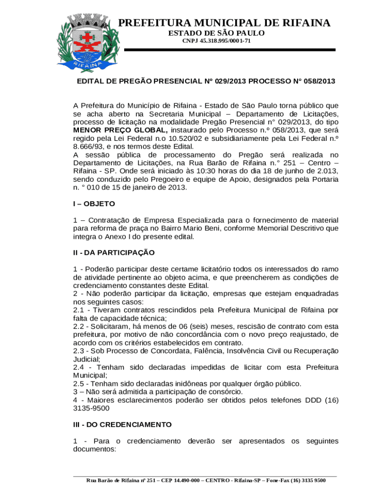 - Search for the A Prefeitura do Municpio de Rifaina - Estado de So Paulo torna pblico que se acha aberto na Secretaria Municipal Departamento de Licitaes, processo de licitao na modalidade Prego Presencial n 029/2013, do tipo MENOR PREO GLOBAL, instaurado pelo Proc form from the PDFfiller’s filebase.