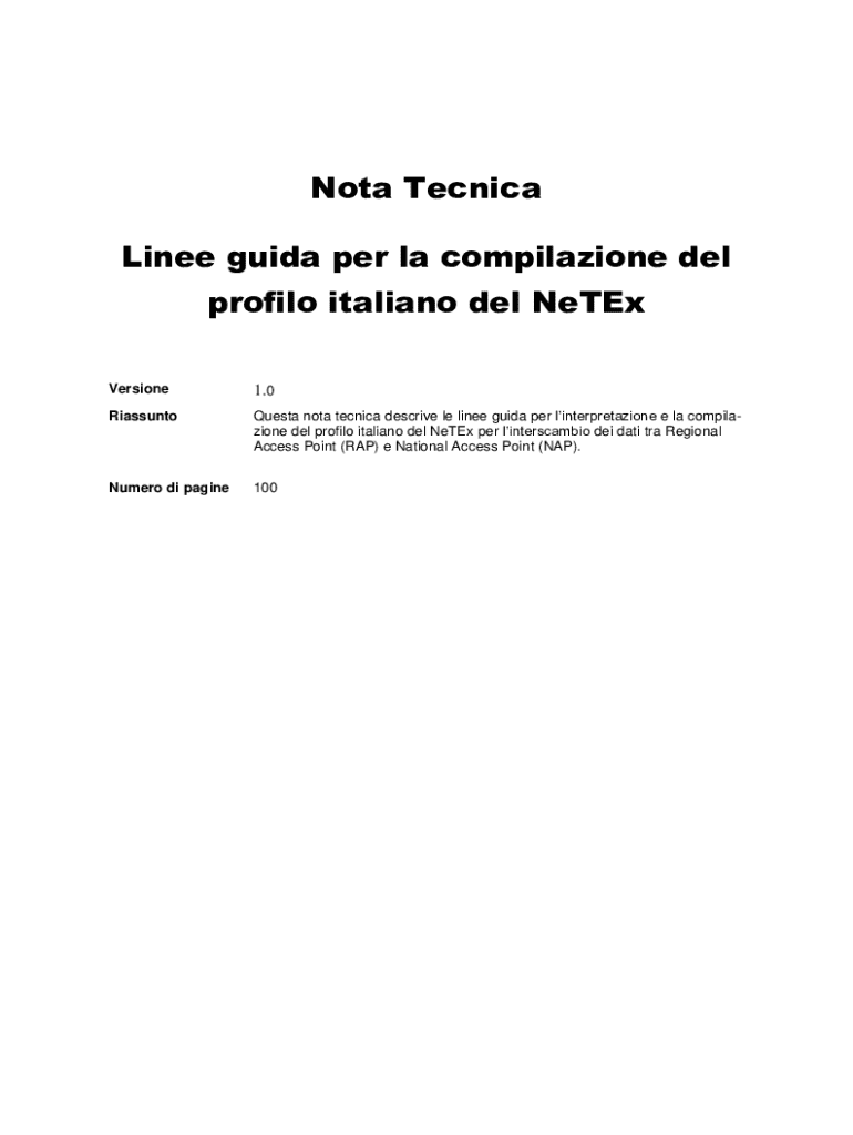 Nota Tecnica Linee guida per la compilazione del profilo italiano del NeTEx Versione1.0RiassuntoQuesta nota tecnica descrive le linee guida per linterpretazione e la compilazione del profilo italiano
