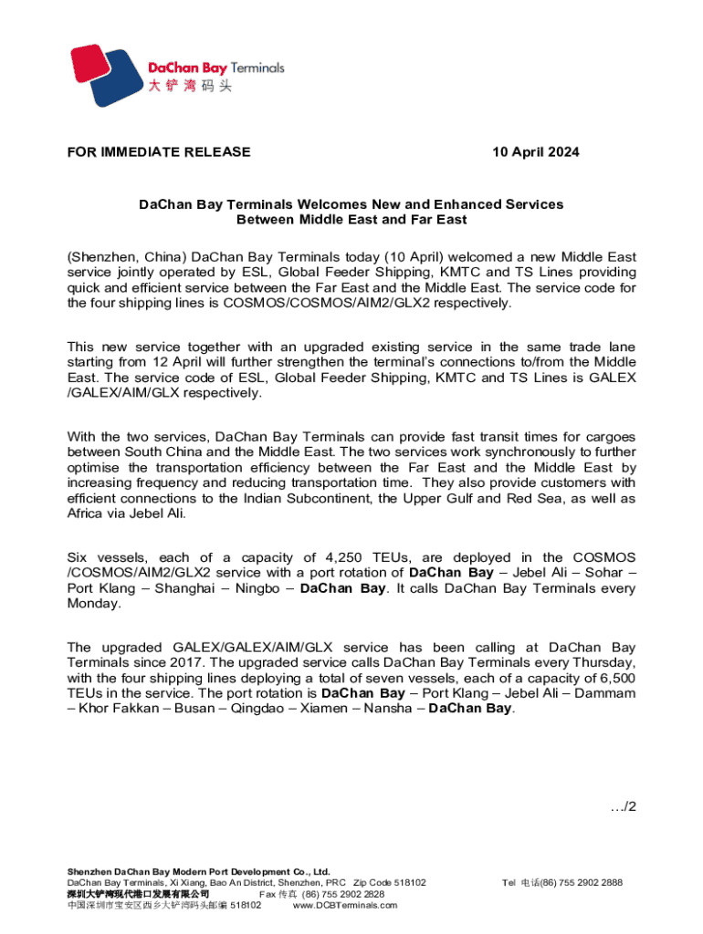 FOR IMMEDIATE RELEASE10 April 2024DaChan Bay Terminals Welcomes New and Enhanced Services Between Middle East and Far East (Shenzhen, China) DaChan Bay Terminals today (10 April) welcomed a new Middle