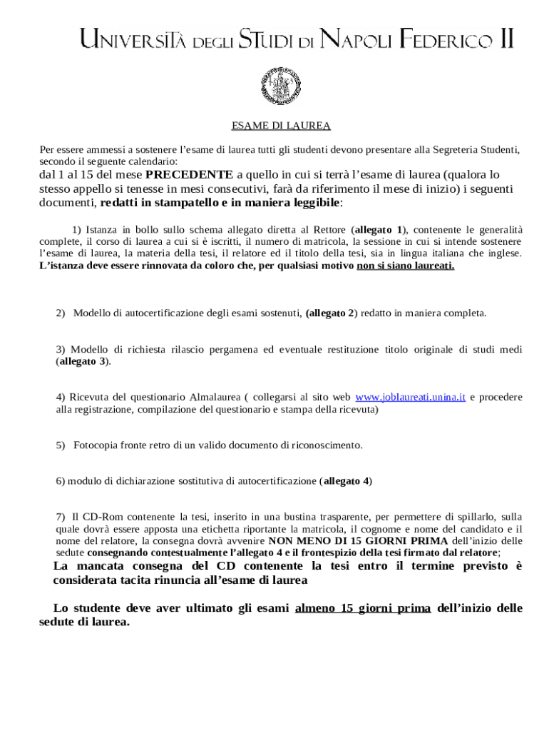 The Per essere ammessi a sostenere l'esame di laurea tutti gli ... is a writable document that can be filled-out and signed for specific reasons. Next, it is furnished to the exact addressee in order to provide some details of certain kinds. The completion and signing is possible in hard copy or using an appropriate service like PDFfiller. Such services help to submit any PDF or Word file without printing out. While doing that, you can customize its appearance depending on your requirements and put a valid digital signature. Once done, you send the Per essere ammessi a sostenere l'esame di laurea tutti gli ... to the recipient or several recipients by mail and also fax. PDFfiller has got a feature and options that make your Word template printable. It offers a number of options for printing out. It doesn't matter how you send a document - in hard copy or electronically - it will always look professional and organized. In order not to create a new writable document from the beginning all the time, turn the original file into a template. Later, you will have an editable sample.