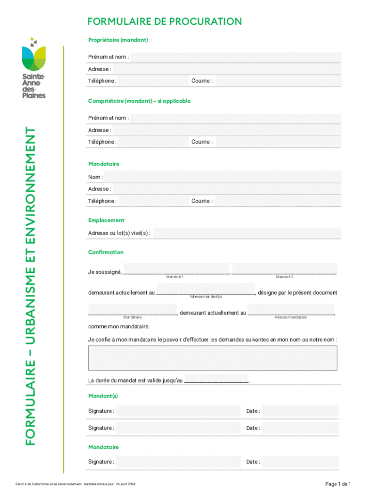 FORMULAIRE DE PROCURATION Propritaire (mandant) Prnom et nom : Adresse : Tlphone :Courriel :Coropritaire (mandant)si applicableFORMULAIREURBANISME ET ENVIRONNEMENTPrnom et nom : Adresse : Tlphone