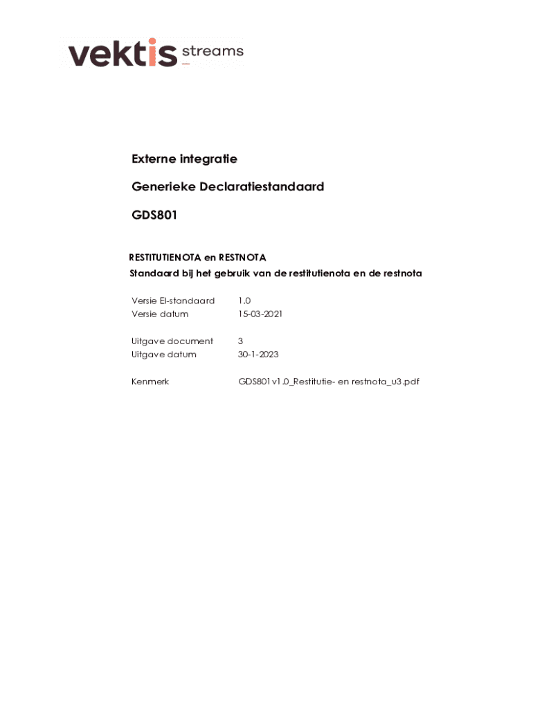Externe integratie Generieke Declaratiestandaard GDS801RESTITUTIENOTA en RESTNOTA Standaard bij het gebruik van de restitutienota en de restnota Versie EIstandaard1.0Versie datum15032021Uitgave document3Uitgave