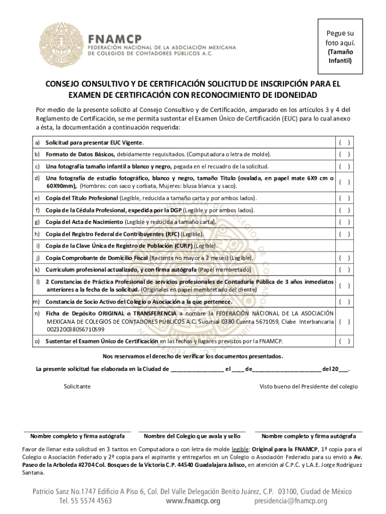 Pegue su foto aqu. (Tamao Infantil)CONSEJO CONSULTIVO Y DE CERTIFICACIN SOLICITUD DE INSCRIPCIN PARA EL EXAMEN DE CERTIFICACIN CON RECONOCIMIENTO DE IDONEIDAD Por medio de la presente solicito al