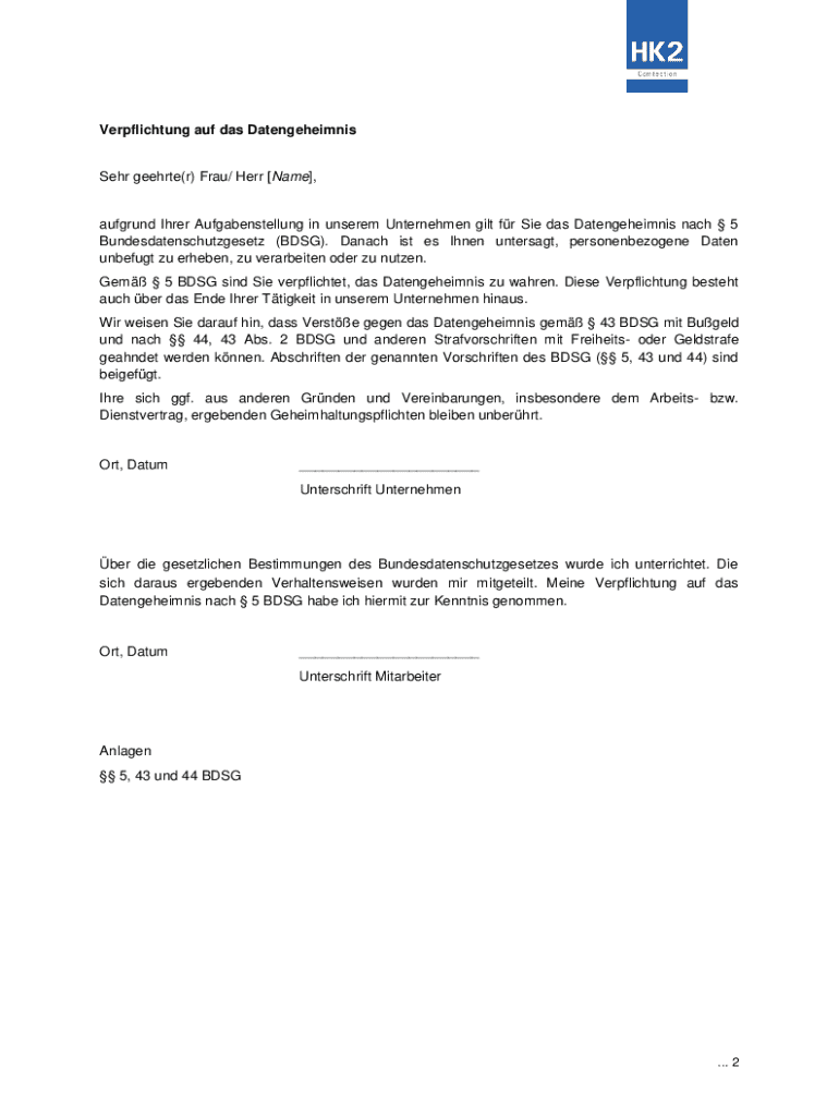 Holen Sie sich kostenlos Verpflichtung auf das Datengeheimnis nach5 BDSG