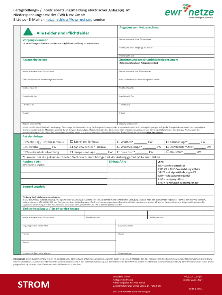 Holen Sie sich kostenlos Fertigstellungs- / Inbetriebsetzungsmeldung elektrischer Anlage(n) am Ni...