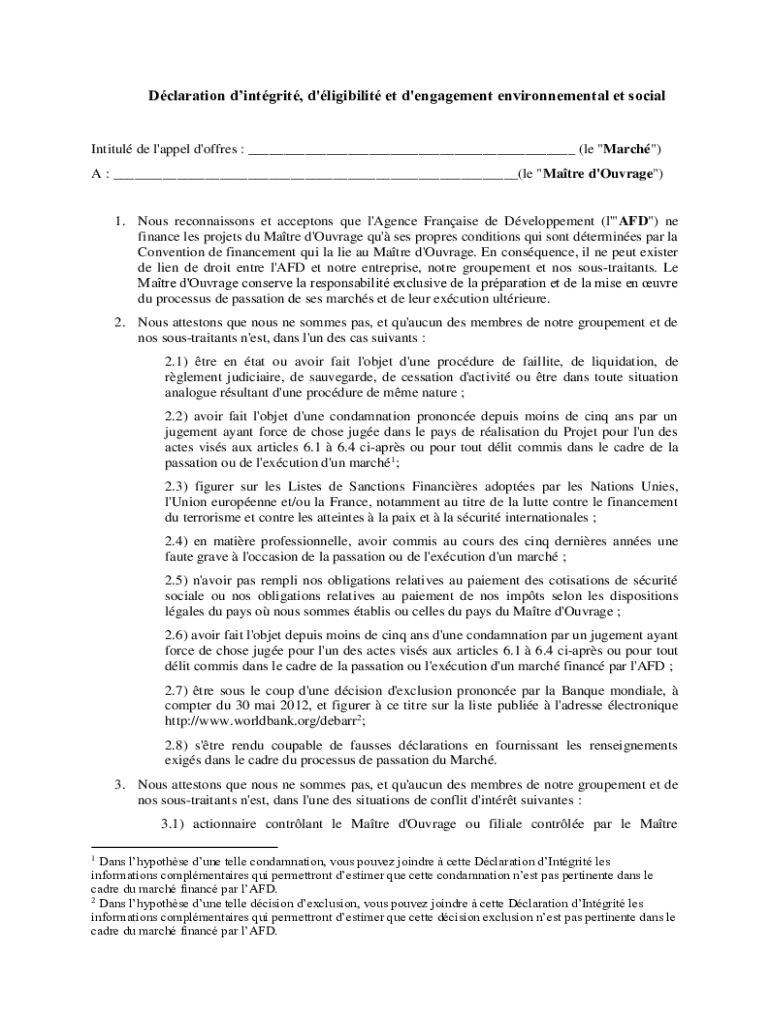 Quelles informations doivent être déclarées sur termes de rfrence pour?