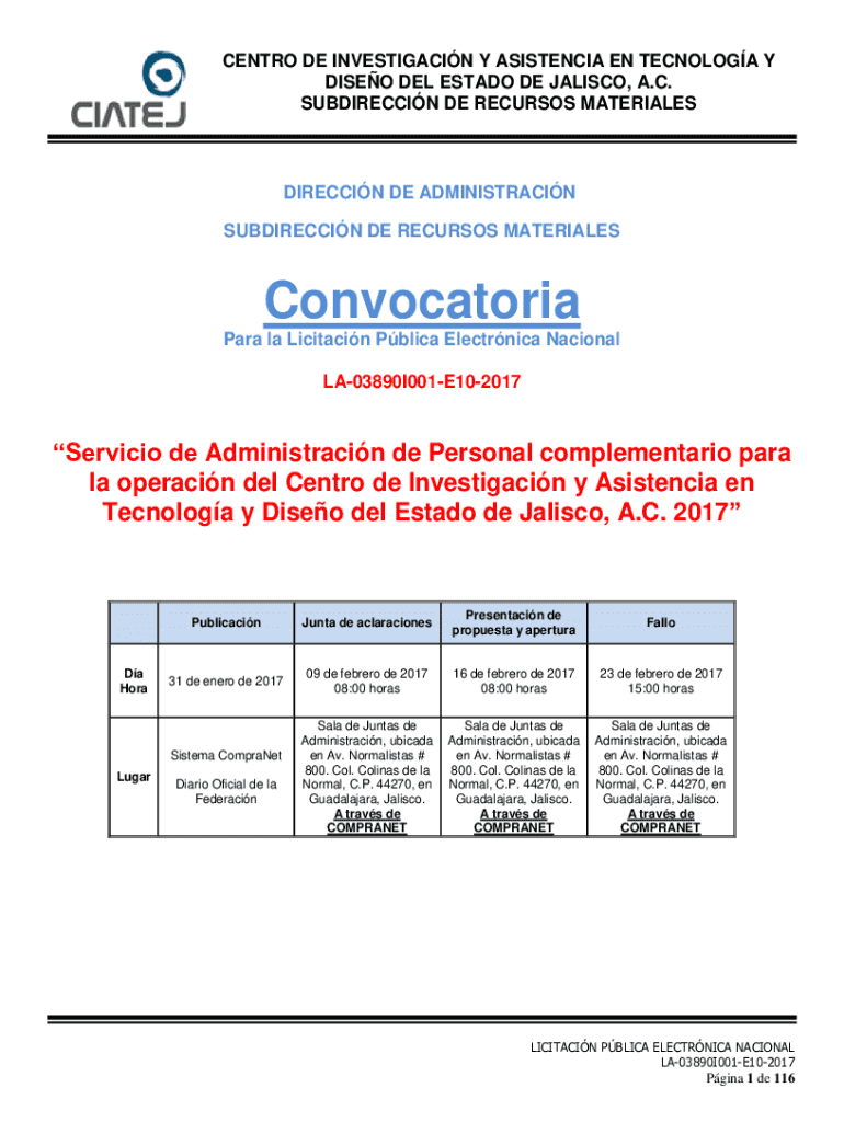 CENTRO DE INVESTIGACIN Y ASISTENCIA EN TECNOLOGA Y DISEO DEL ESTADO DE JALISCO, A.C. SUBDIRECCIN DE RECURSOS MATERIALESDIRECCIN DE ADMINISTRACIN SUBDIRECCIN DE RECURSOS MATERIALESConvocatoria Para