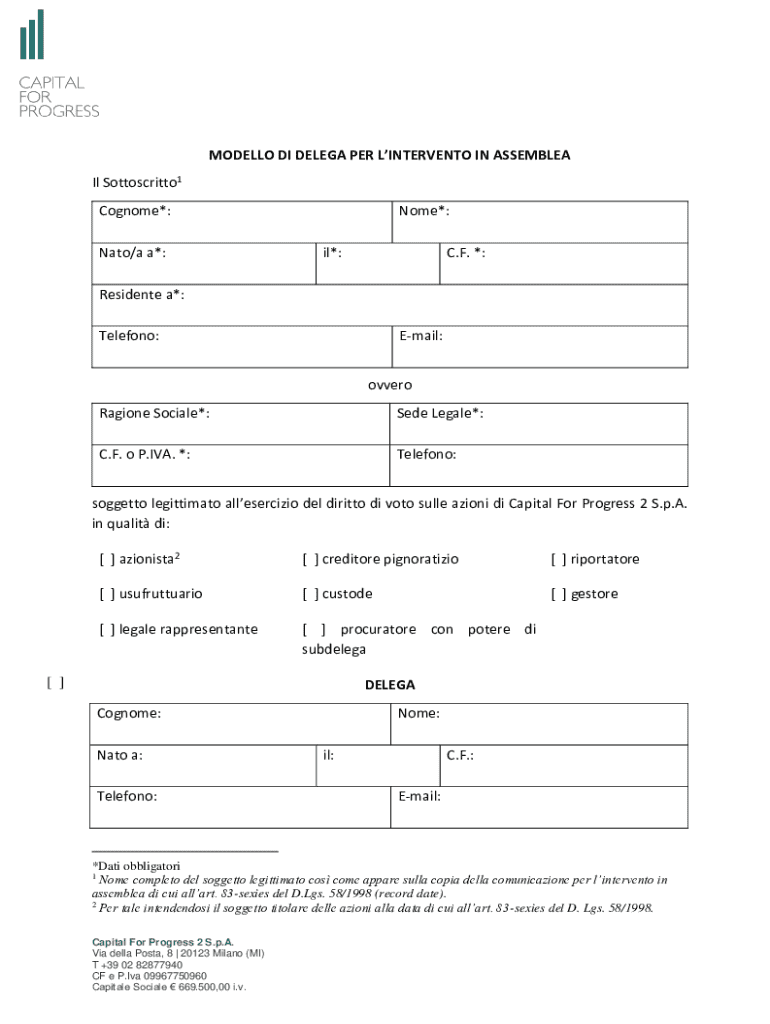 MODELLO DI DELEGA PER LINTERVENTO IN ASSEMBLEA Il Sottoscritto1 Cognome*: Nato/a a*:Nome*: il*:C.F. *:Residente a*: Telefono:Email: ovveroRagione Sociale*:Sede Legale*:C.F. o P.IVA. *:Telefono:soggetto