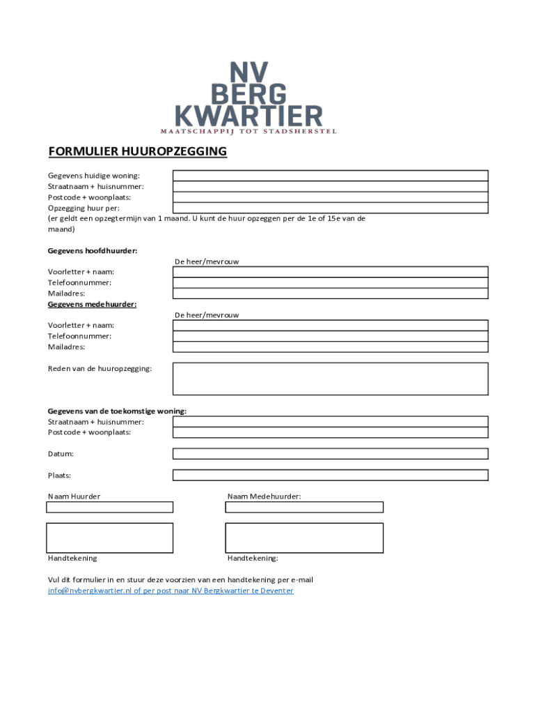 FORMULIER HUUROPZEGGING Gegevens huidige woning: Straatnaam + huisnummer: Postcode + woonplaats: Opzegging huur per: (er geldt een opzegtermijn van 1 maand. U kunt de huur opzeggen per de 1e of 15e