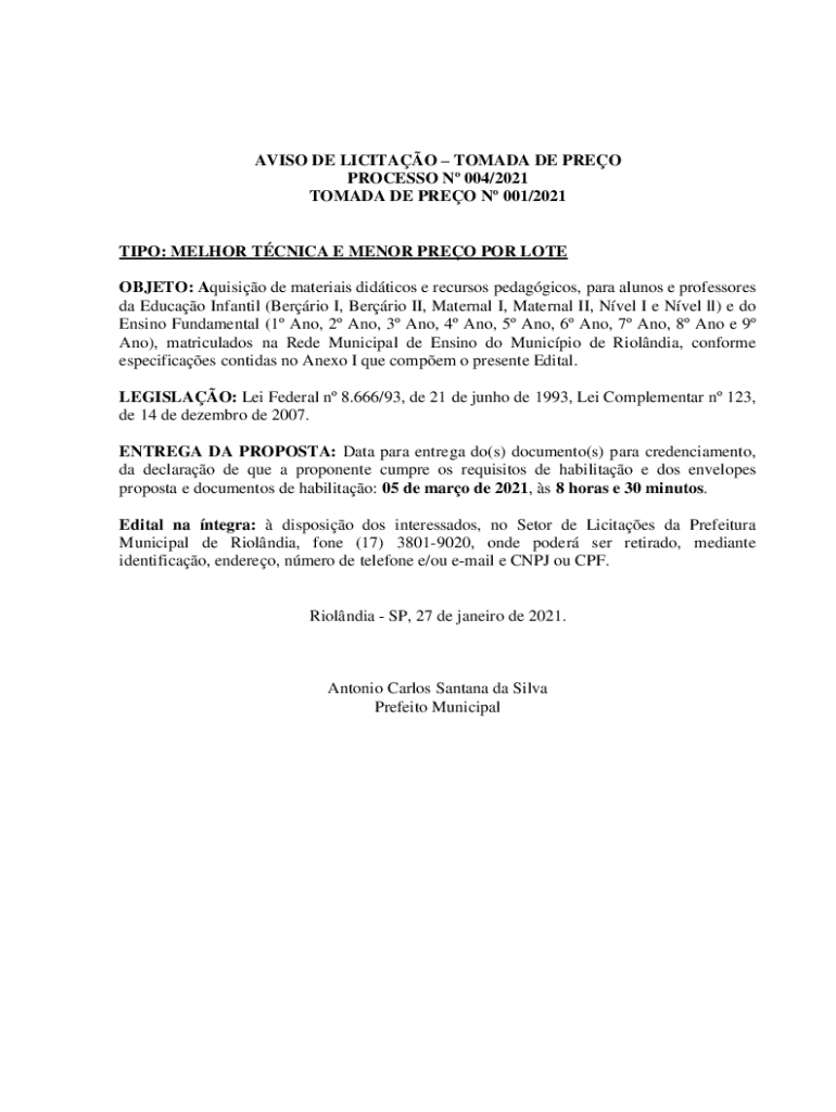 Obtenha o gratuito AVISO DE LICITAO TOMADA DE PREO