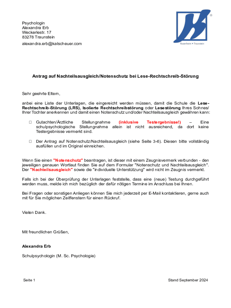 Holen Sie sich kostenlos Antrag auf Nachteilsausgleich/Notenschutz bei Lese-Rechtschreib-Strung