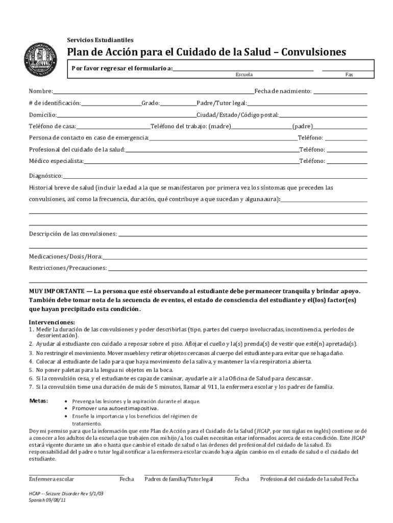Servicios EstudiantilesPlan de Accin para el Cuidado de la SaludConvulsiones Por favor regresar el formulario a: Nombre:# de identificacin:Grado:Domicilio:Telfono de casa:Persona de contacto en caso