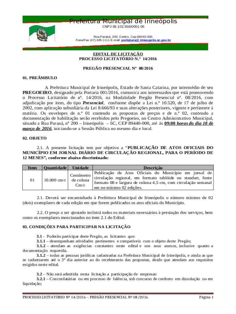 Instructions for the A Prefeitura Municipal de Irinepolis, Estado de Santa Catarina, por intermdio de seu PREGOEIRO, designado pela Portaria 001/2016, comunica aos interessados que est promovendo o Processo Licitatrio de n form