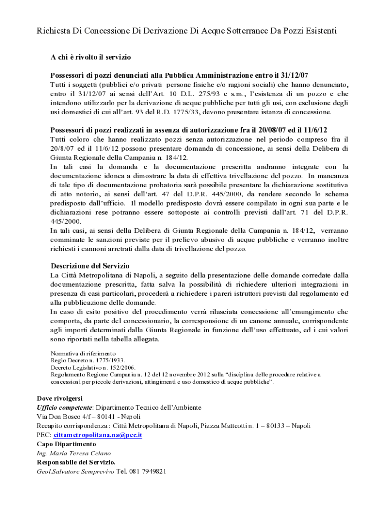 Richiesta Di Concessione Di Derivazione Di Acque Sotterranee Da Pozzi Esistenti A chirivolto il servizio Possessori di pozzi denunciati alla Pubblica Amministrazione entro il 31/12/07 Tutti i soggetti