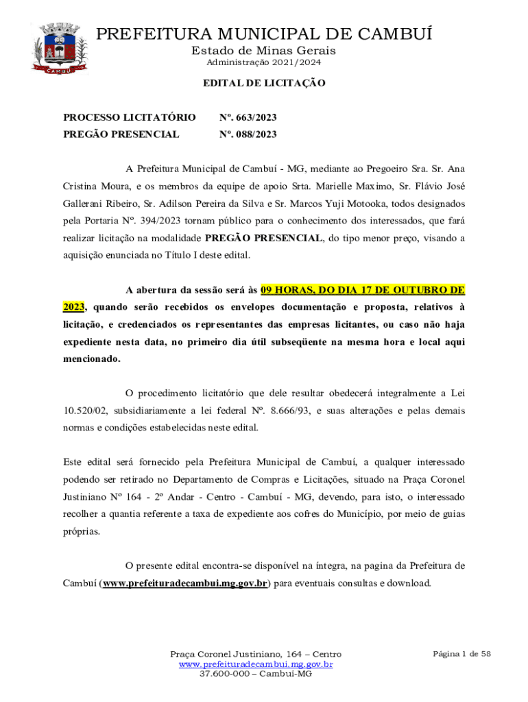 Obtenha o gratuito A Prefeitura Municipal de Cambu - MG, mediante ao Pregoeiro Sra