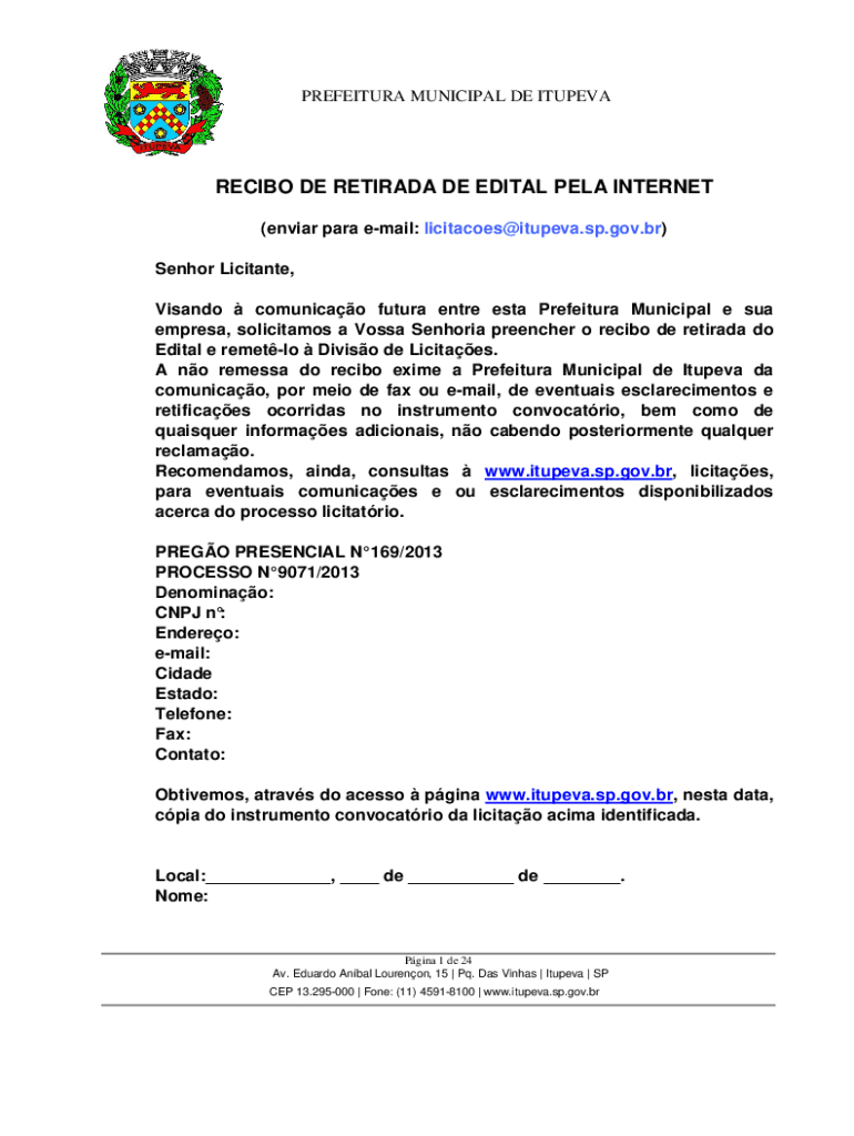 PREFEITURA MUNICIPAL DE ITUPEVARECIBO DE RETIRADA DE EDITAL PELA INTERNET (enviar para email: licitacoes@itupeva.sp.gov.br) Senhor Licitante, Visandocomunicao futura entre esta Prefeitura Municipal