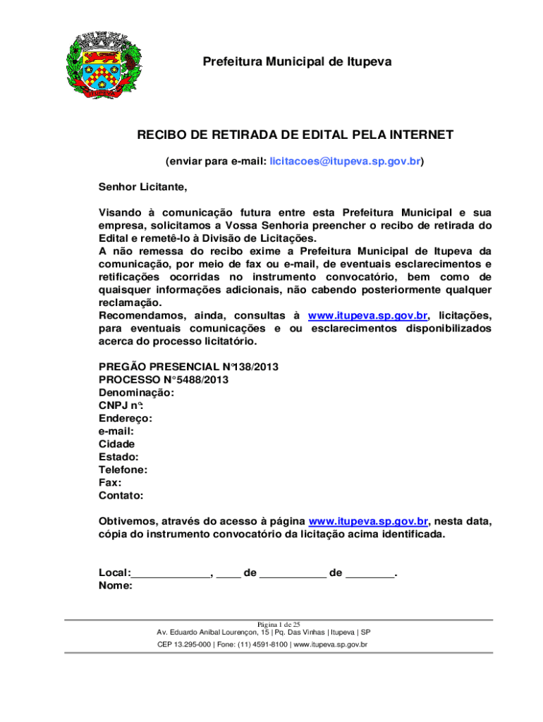 Prefeitura Municipal de ItupevaRECIBO DE RETIRADA DE EDITAL PELA INTERNET (enviar para email: licitacoes@itupeva.sp.gov.br) Senhor Licitante, Visandocomunicao futura entre esta Prefeitura Municipal