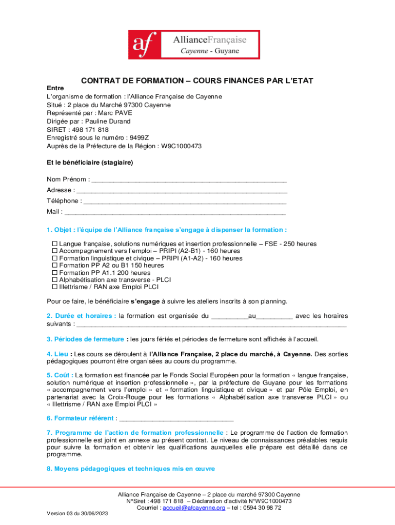 Cay n CONTRAT DE FORMATIONCOURS FINANCES PAR LETAT Entre Lorganisme de formation : lAlliance Franaise de Cayenne Situ : 2 place du March 97300 Cayenne Reprsent par : Marc PAVE Dirige par : Pauline