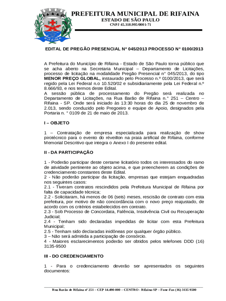 A Prefeitura do Municpio de Rifaina - Estado de So Paulo torna pblico que se acha aberto na Secretaria Municipal Departamento de Licitaes, processo de licitao na modalidade Prego Presencial n 045/2013, do tipo MENOR PREO GLOBAL, instaurado pelo Proc template instructions