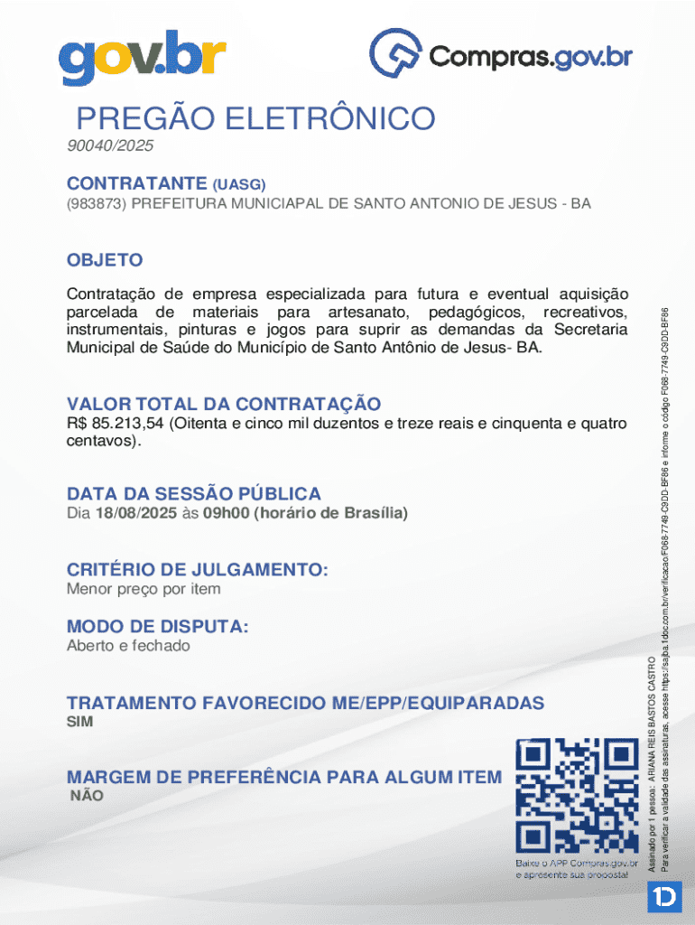 PREGO ELETRNICO 90040/2025CONTRATANTE (UASG) (983873) PREFEITURA MUNICIAPAL DE SANTO ANTONIO DE JESUSBAContratao de empresa especializada para futura e eventual aquisio parcelada de materiais para