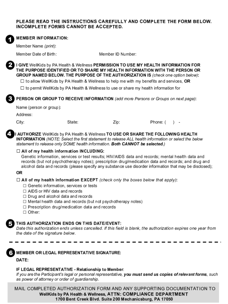 Get the free Completing this form will allow WellKids by PA Health & Wellness to (i) use your hea...