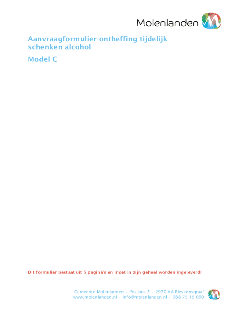 Aanvraagformulier ontheffing tijdelijk schenken alcohol Model CDit formulier bestaat uit 5 paginas en moet in zijn geheel worden ingeleverd!Gemeente MolenlandenPostbus 52970 AA Bleskensgraaf www.molenlanden.nlinfo@molenlanden.nl088