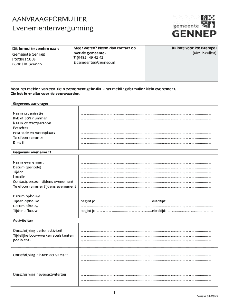 AANVRAAGFORMULIER Evenementenvergunning Dit formulier zenden naar: Gemeente Gennep Postbus 9003 6590 HD GennepMeer weten? Neem dan contact op met de gemeente. T (0485) 49 41 41 E gemeente@gennep.nlRuimte