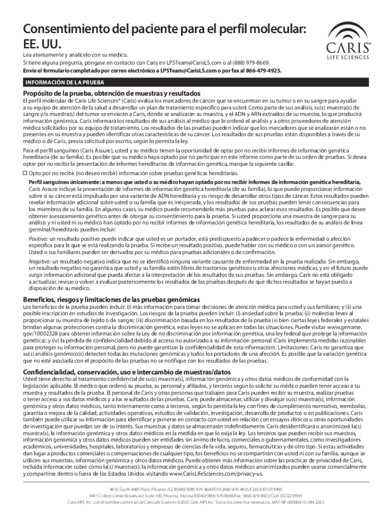Consentimiento del paciente para el perfil molecular: EE. UU. Lea atentamente y analcelo con su mdico. Si tiene alguna pregunta, pngase en contacto con Caris en LPSTeam@CarisLS.com o al (888) 9798669.