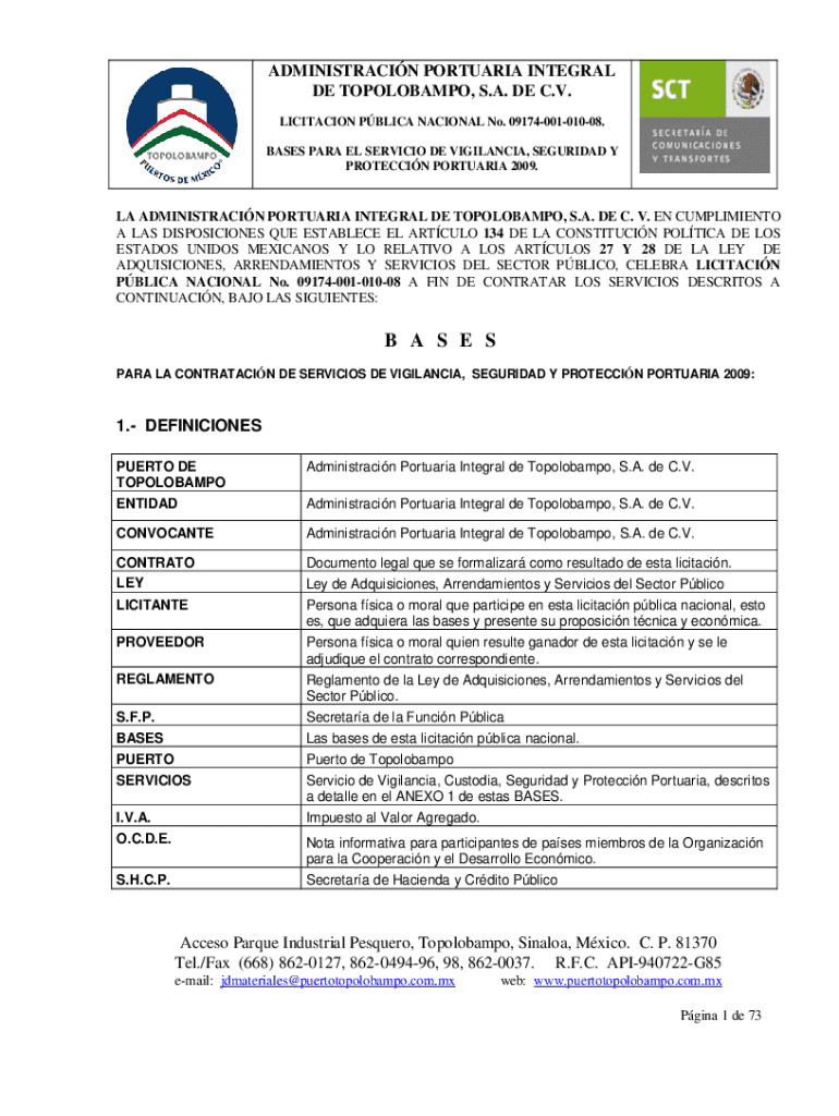 ADMINISTRACIN PORTUARIA INTEGRAL DE TOPOLOBAMPO, S.A. DE C.V. LICITACION PBLICA NACIONAL No. 0917400101008. BASES PARA EL SERVICIO DE VIGILANCIA, SEGURIDAD Y PROTECCIN PORTUARIA 2009.LA ADMINISTRACIN