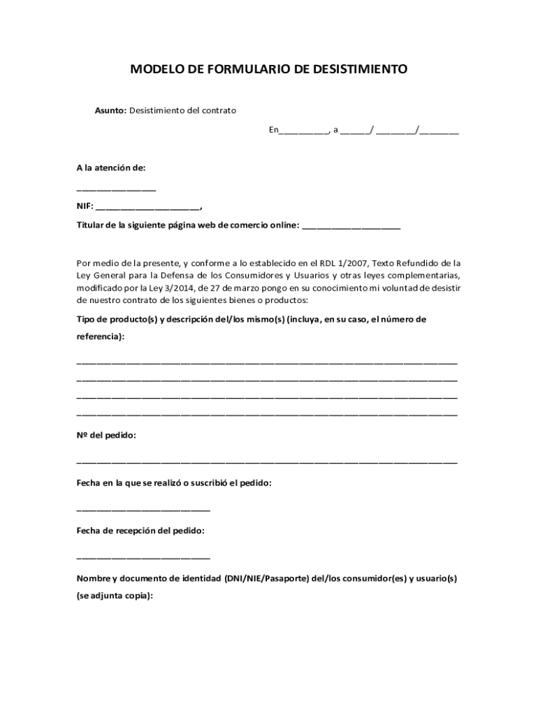 Obtener el gratis Modelo de Formulario de Desistimiento de Contrato