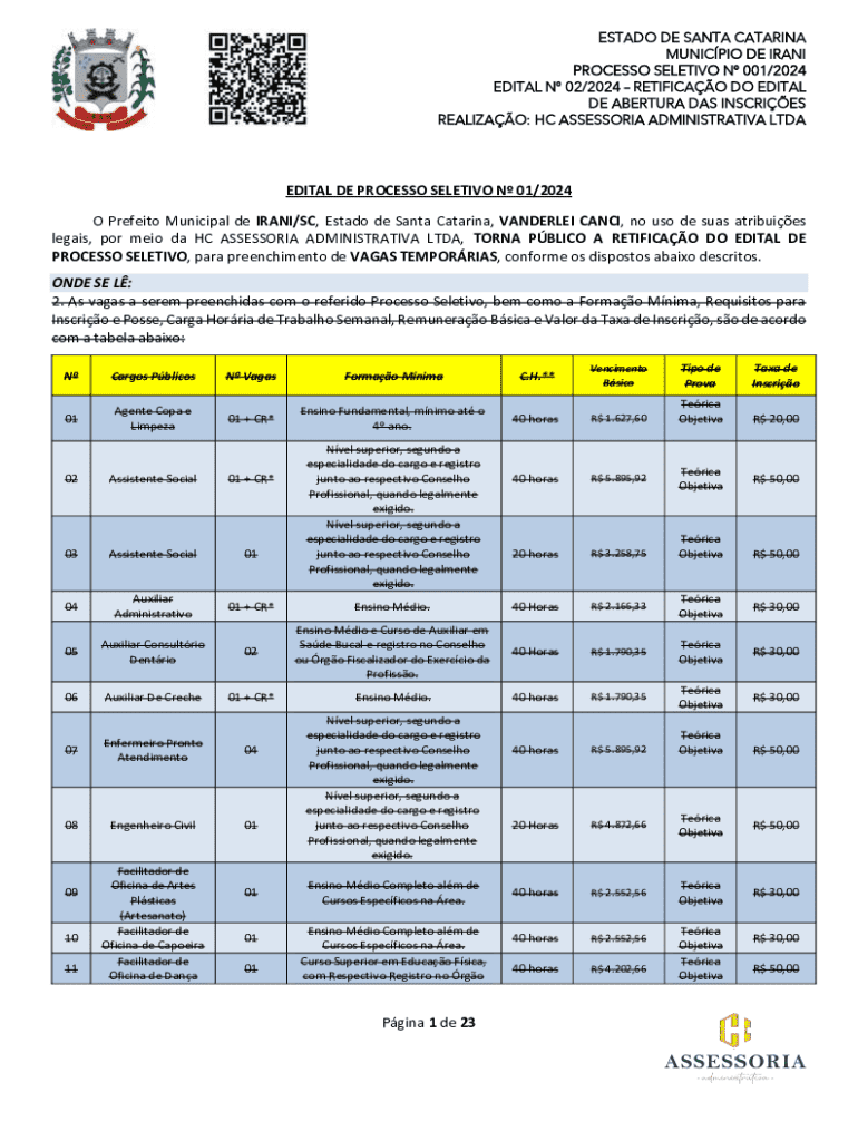 Obtenha o gratuito Pgina 1 de 23 EDITAL DE PROCESSO SELETIVO N 01/ ...