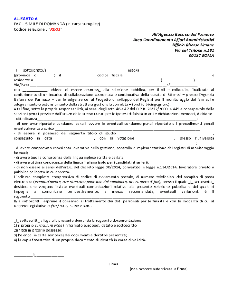 Ottieni il gratuito FACSIMILE DI DOMANDA (in carta semplice) - ALLEGATO A. Codice selezione