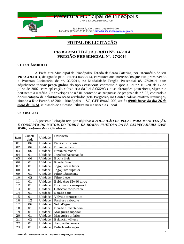 Instructions for the 27/2014, com adjudicao menor preo global, do tipo Presencial, cone dispe a Lei n form