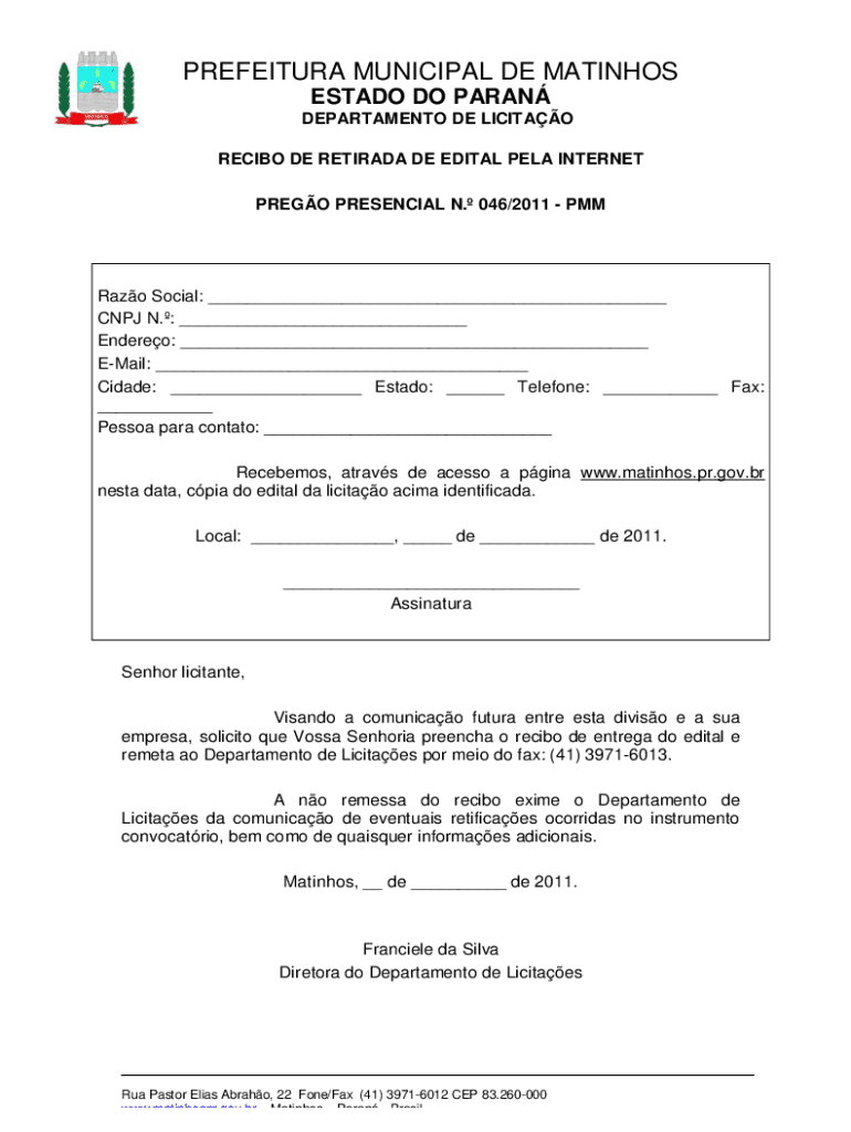 Obtenha o gratuito O MUNICPIO DE MATINHOS torna pblico que realizar procedimento