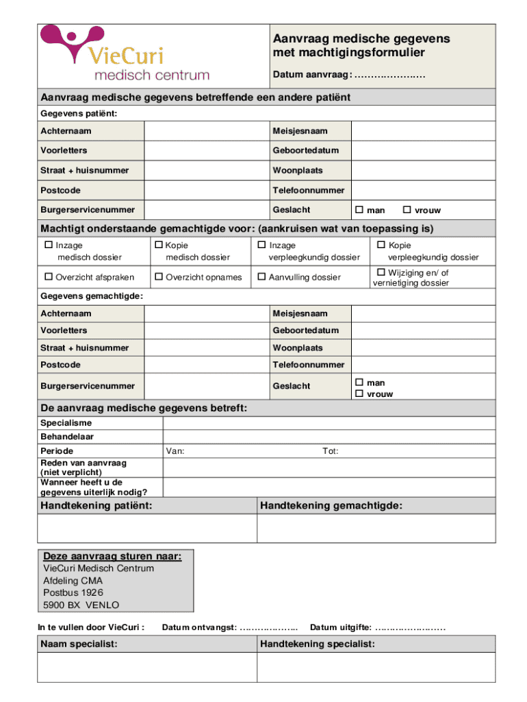 Aanvraag medische gegevens met machtigingsformulier Datum aanvraag: .Aanvraag medische gegevens betreffende een andere patint Gegevens patint: AchternaamMeisjesnaamVoorlettersGeboortedatumStraat +