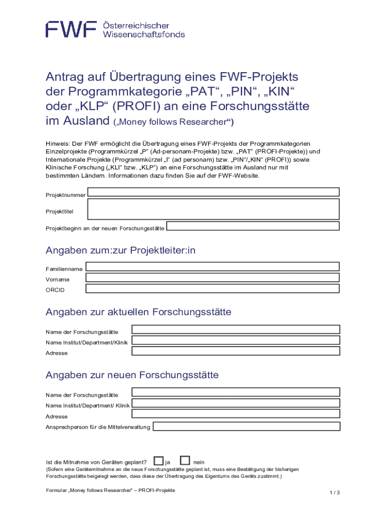 Antrag auf bertragung eines FWFProjekts der Programmkategorie PAT, PIN, KIN oder KLP (PROFI) an eine Forschungssttte im Ausland (Money follows Researcher) Hinweis: Der FWF ermglicht die bertragung