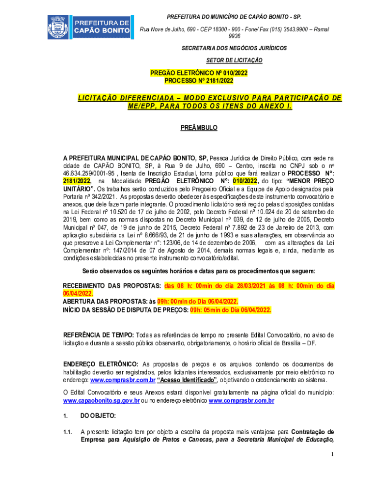 PREFEITURA DO MUNICPIO DE CAPO BONITOSP. Rua Nove de Julho, 690CEP 18300900Fone/ Fax (015) 3543.9900Ramal 9936 SECRETARIA DOS NEGCIOS JURDICOS SETOR DE LICITAOPREGO ELETRNICO N 010/2022 PROCESSO N