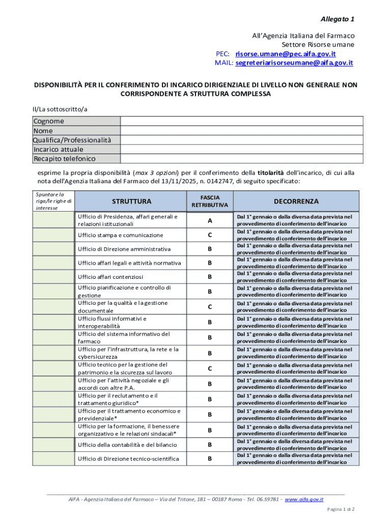 Allegato 1 AllAgenzia Italiana del Farmaco Settore Risorse umane PEC: risorse.umane@pec.aifa.gov.it MAIL: segreteriarisorseumane@aifa.gov.it DISPONIBILIT PER IL CONFERIMENTO DI INCARICO DIRIGENZIALE