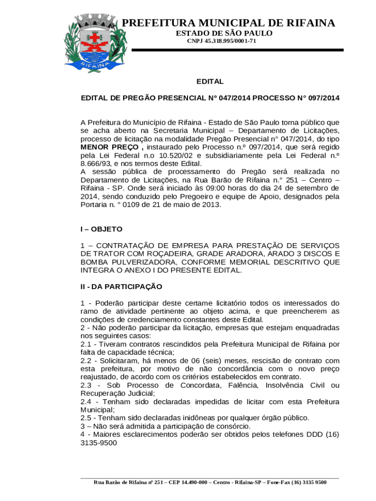 Instructions for the form A Prefeitura do Municpio de Rifaina - Estado de So Paulo torna pblico que se acha aberto na Secretaria Municipal Departamento de Licitaes, processo de licitao na modalidade Prego Presencial n 047/2014, do tipo MENOR PREO , instaurado pelo Processo n