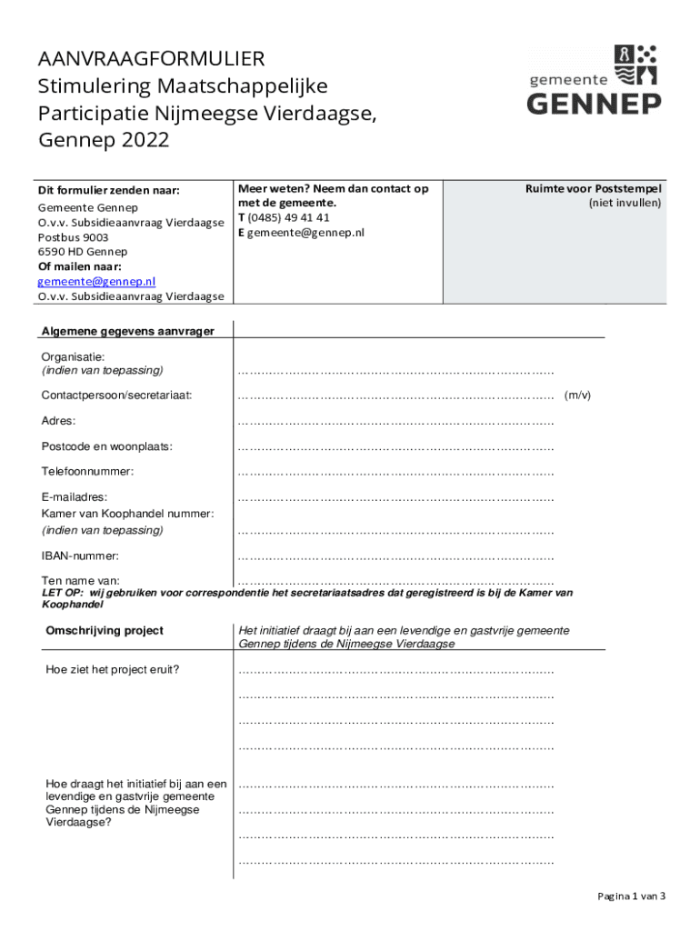 AANVRAAGFORMULIER Stimulering Maatschappelijke Participatie Nijmeegse Vierdaagse, Gennep 2022 Dit formulier zenden naar: Gemeente Gennep O.v.v. Subsidieaanvraag Vierdaagse Postbus 9003 6590 HD Gennep