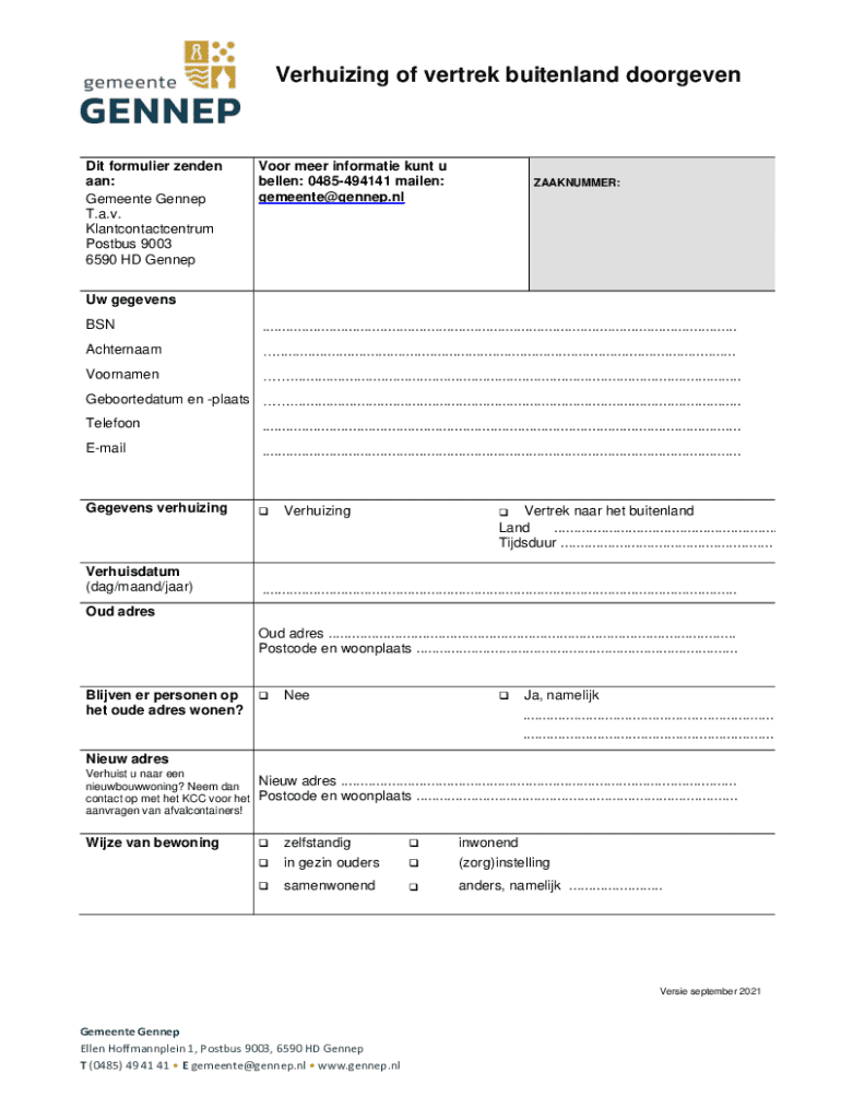 Verhuizing of vertrek buitenland doorgevenDit formulier zenden aan: Gemeente Gennep T.a.v. Klantcontactcentrum Postbus 9003 6590 HD GennepVoor meer informatie kunt u bellen: 0485494141 mailen: gemeente@gennep.nlZAAKNUMMER:Uw